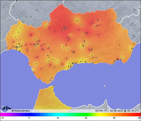 | 03-08-2025 | | | Máx. | Mín. | | | Temperatura | 40,3 | 25,4 | °C | | Humedad | 58 | 20 | % | | Viento | 26 | n/a | km/h | | Presión | 1.019 | 1.013 | hPa | | Precipitación | 0,0 | mm |