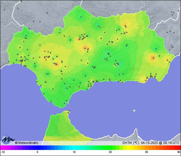 | 03-10-2025 | | | Máx. | Mín. | | | Temperatura | 34,0 | 18,4 | °C | | Humedad | 81 | 28 | % | | Viento | 15 | n/a | km/h | | Presión | 1.023 | 1.020 | hPa | | Precipitación | 0,0 | mm |