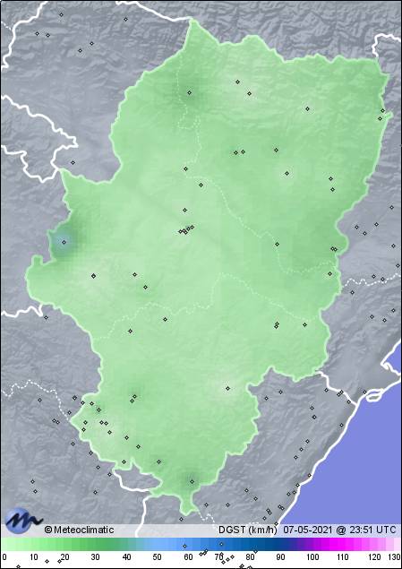 | 07-05-2021 | | | Máx. | Mín. | | | Temperatura | 21,9 | 7,1 | °C | | Humedad | 82 | 36 | % | | Viento | 23 | n/a | km/h | | Presión | 1.020 | 1.018 | hPa | | Precipitación | 0,0 | mm |
