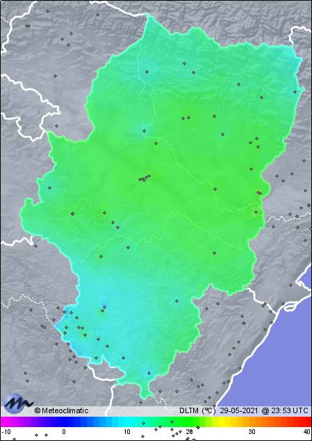 | 29-05-2021 | | | Máx. | Mín. | | | Temperatura | 28,6 | 6,3 | °C | | Humedad | 95 | 29 | % | | Viento | 32 | n/a | km/h | | Presión | 1.022 | 1.017 | hPa | | Precipitación | 0,0 | mm |