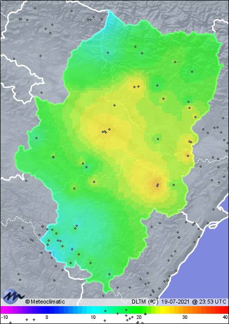| 19-07-2021 | | | Máx. | Mín. | | | Temperatura | 36,8 | 21,4 | °C | | Humedad | 72 | 23 | % | | Viento | 39 | n/a | km/h | | Presión | 1.015 | 1.009 | hPa | | Precipitación | 0,0 | mm |