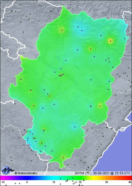 | 30-09-2021 | | | Máx. | Mín. | | | Temperatura | 21,3 | 10,2 | °C | | Humedad | 86 | 49 | % | | Viento | 18 | n/a | km/h | | Presión | 1.025 | 1.020 | hPa | | Precipitación | 0,0 | mm |