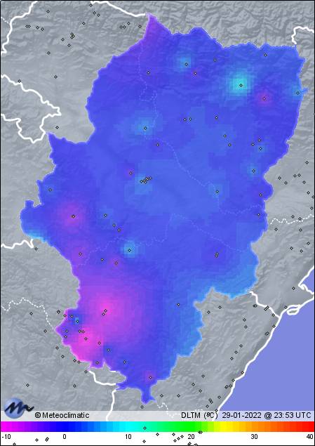 | 29-01-2022 | | | Máx. | Mín. | | | Temperatura | 14,7 | -4,5 | °C | | Presión | 1.049 | 1.038 | hPa | | Precipitación | 0,0 | mm |
