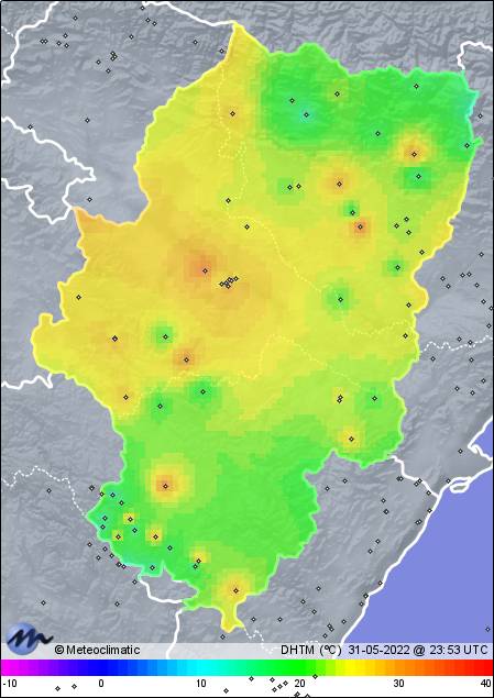| 31-05-2022 | | | Máx. | Mín. | | | Temperatura | 29,8 | 6,7 | °C | | Humedad | 91 | 23 | % | | Viento | 24 | n/a | km/h | | Presión | 1.013 | 1.010 | hPa | | Precipitación | 0,0 | mm |