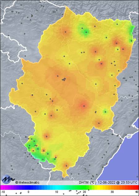 | 12-06-2022 | | | Máx. | Mín. | | | Temperatura | 35,7 | 17,4 | °C | | Humedad | 91 | 23 | % | | Viento | 30 | n/a | km/h | | Presión | 1.023 | 1.018 | hPa | | Precipitación | 0,0 | mm |