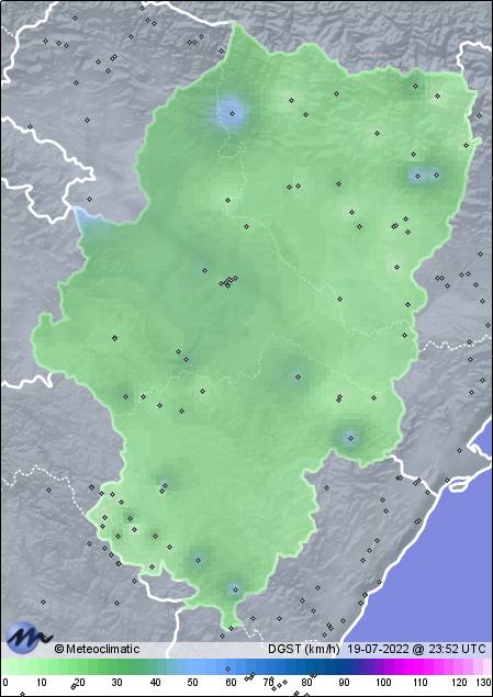 | 19-07-2022 | | | Máx. | Mín. | | | Temperatura | 35,5 | 18,6 | °C | | Humedad | 97 | 24 | % | | Viento | 55 | n/a | km/h | | Presión | 1.013 | 1.007 | hPa | | Precipitación | 9,4 | mm |