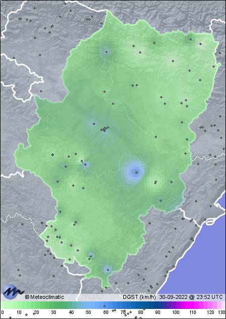 | 30-09-2022 | | | Máx. | Mín. | | | Temperatura | 15,9 | 5,9 | °C | | Humedad | 85 | 44 | % | | Viento | 52 | n/a | km/h | | Presión | 1.023 | 1.009 | hPa | | Precipitación | 0,0 | mm |