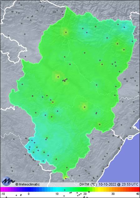 | 10-10-2022 | | | Máx. | Mín. | | | Temperatura | 17,1 | 9,0 | °C | | Humedad | 98 | 75 | % | | Viento | 22 | n/a | km/h | | Precipitación | 0,0 | mm |