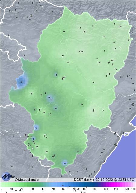 | 30-12-2022 | | | Máx. | Mín. | | | Temperatura | 10,7 | 5,0 | °C | | Humedad | 87 | 51 | % | | Viento | 62 | n/a | km/h | | Precipitación | 0,0 | mm |