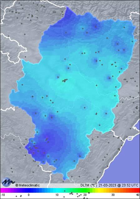 | 21-03-2023 | | | Máx. | Mín. | | | Temperatura | 17,9 | 1,6 | °C | | Humedad | 79 | 23 | % | | Viento | 23 | n/a | km/h | | Presión | 1.023 | 1.017 | hPa | | Precipitación | 0,0 | mm |