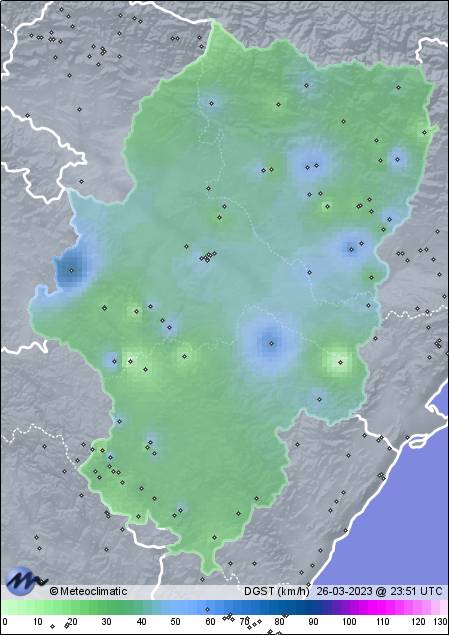 | 26-03-2023 | | | Máx. | Mín. | | | Temperatura | 15,5 | 7,2 | °C | | Humedad | 80 | 34 | % | | Viento | 45 | n/a | km/h | | Presión | 1.019 | 1.014 | hPa | | Precipitación | 0,0 | mm |