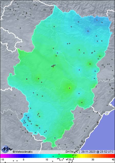 | 29-11-2023 | | | Máx. | Mín. | | | Temperatura | 13,5 | 7,5 | °C | | Humedad | 93 | 72 | % | | Viento | 9 | n/a | km/h | | Presión | 1.012 | 1.007 | hPa |