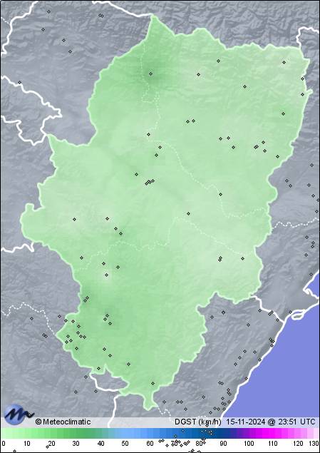 | 15-11-2024 | | | Máx. | Mín. | | | Temperatura | 9,8 | 5,4 | °C | | Humedad | 95 | 82 | % | | Viento | 48 | n/a | km/h | | Presión | 1.023 | 1.020 | hPa | | Precipitación | 0,0 | mm |