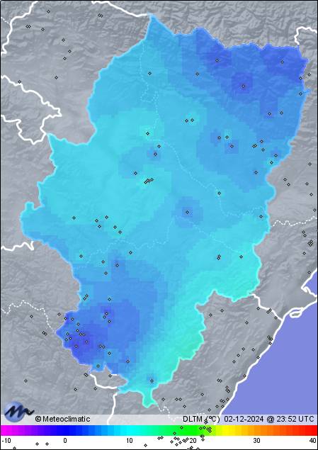 | 02-12-2024 | | | Máx. | Mín. | | | Temperatura | 11,0 | 3,6 | °C | | Humedad | 85 | 64 | % | | Viento | 32 | n/a | km/h | | Presión | 1.025 | 1.023 | hPa | | Precipitación | 0,0 | mm |