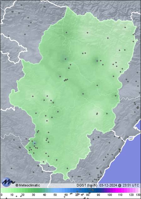 | 03-12-2024 | | | Máx. | Mín. | | | Temperatura | 11,4 | 5,3 | °C | | Humedad | 93 | 69 | % | | Viento | 35 | n/a | km/h | | Precipitación | 0,0 | mm |
