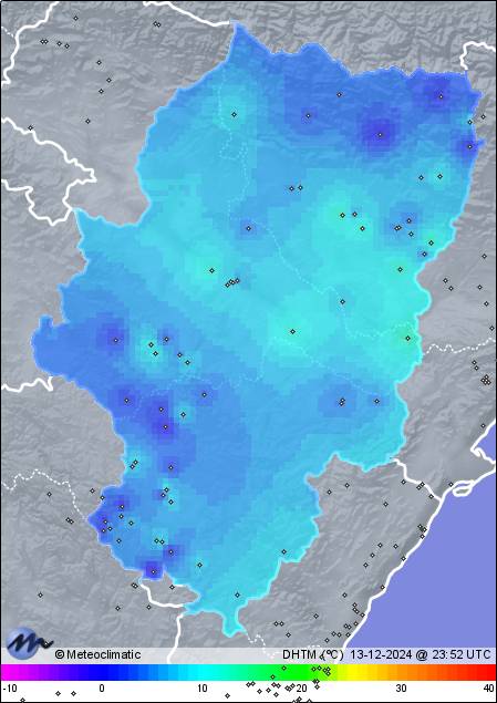 | 13-12-2024 | | | Máx. | Mín. | | | Temperatura | 8,4 | -0,9 | °C | | Humedad | 92 | 61 | % | | Viento | 17 | n/a | km/h |
