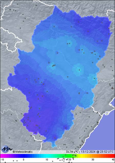 | 13-12-2024 | | | Máx. | Mín. | | | Temperatura | 11,8 | 5,9 | °C | | Humedad | 91 | 70 | % | | Viento | 5 | n/a | km/h | | Presión | 1.030 | 1.024 | hPa |
