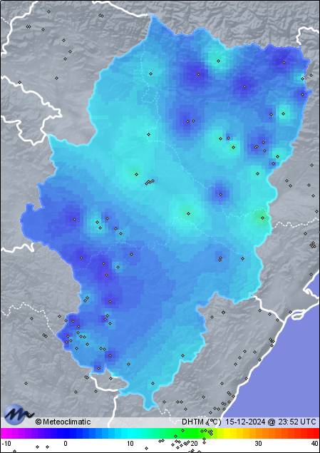 | 15-12-2024 | | | Máx. | Mín. | | | Temperatura | 6,7 | -0,9 | °C | | Precipitación | 0,0 | mm |