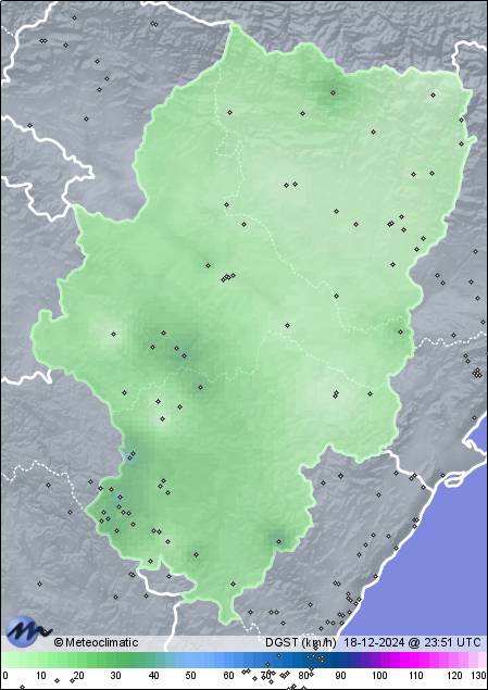 | 18-12-2024 | | | Máx. | Mín. | | | Temperatura | 15,5 | 3,5 | °C | | Humedad | 70 | 36 | % | | Viento | 46 | n/a | km/h | | Precipitación | 0,0 | mm |