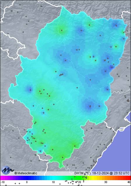 | 18-12-2024 | | | Máx. | Mín. | | | Temperatura | 17,2 | -3,1 | °C | | Humedad | 94 | 31 | % | | Viento | 18 | n/a | km/h | | Presión | 1.040 | 1.025 | hPa | | Precipitación | 0,0 | mm |