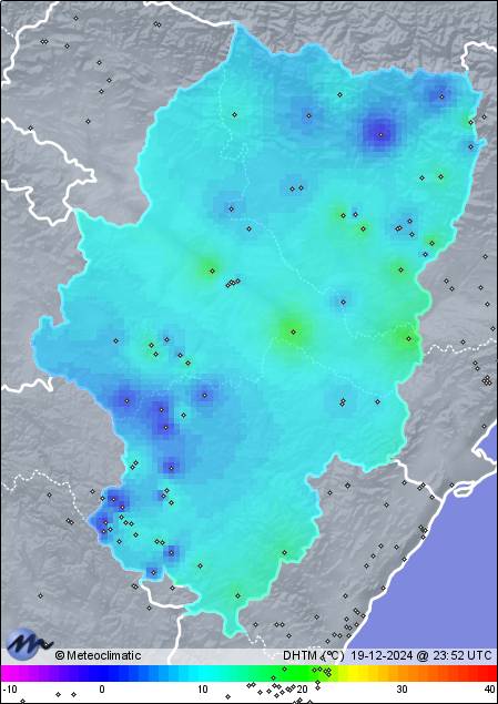 | 19-12-2024 | | | Máx. | Mín. | | | Temperatura | 18,6 | 2,0 | °C | | Humedad | 92 | 56 | % | | Viento | 36 | n/a | km/h | | Presión | 1.030 | 1.021 | hPa | | Precipitación | 0,0 | mm |