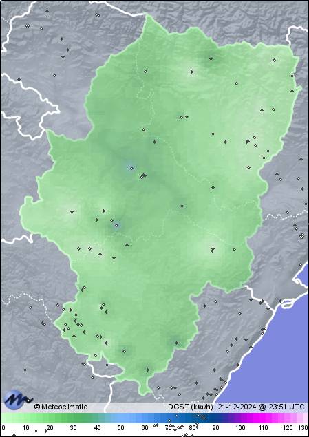 | 21-12-2024 | | | Máx. | Mín. | | | Temperatura | 7,5 | 0,1 | °C | | Humedad | 91 | 70 | % | | Viento | 33 | n/a | km/h | | Precipitación | 0,0 | mm |