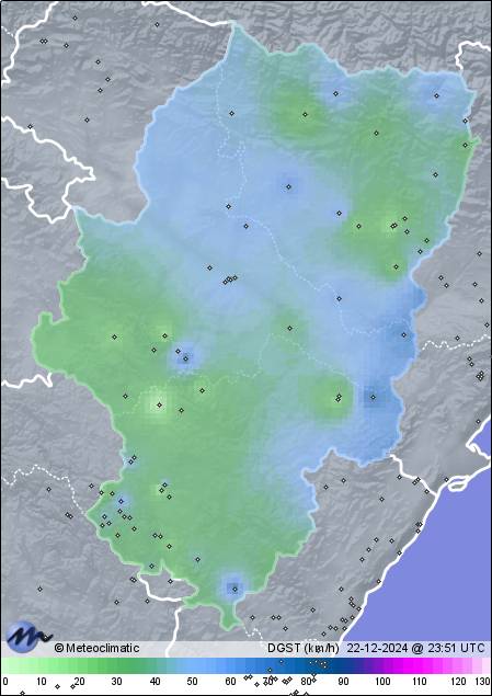 | 22-12-2024 | | | Máx. | Mín. | | | Temperatura | 13,5 | 2,8 | °C | | Humedad | 73 | 44 | % | | Viento | 48 | n/a | km/h |