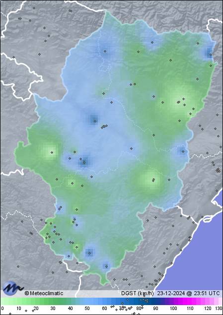 | 23-12-2024 | | | Máx. | Mín. | | | Temperatura | 9,3 | 5,8 | °C | | Humedad | 82 | 62 | % | | Viento | 63 | n/a | km/h | | Presión | 1.026 | 1.019 | hPa | | Precipitación | 0,0 | mm |