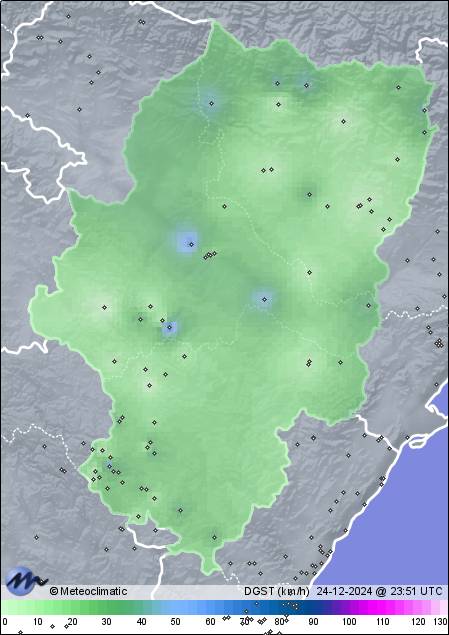 | 24-12-2024 | | | Máx. | Mín. | | | Temperatura | 15,5 | 8,1 | °C | | Humedad | 80 | 67 | % | | Viento | 58 | n/a | km/h | | Presión | 1.029 | 1.026 | hPa | | Precipitación | 0,0 | mm |