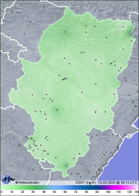 | 09-03-2025 | | | Máx. | Mín. | | | Temperatura | 9,7 | 2,5 | °C | | Humedad | 100 | 66 | % | | Viento | 43 | n/a | km/h | | Presión | 1.003 | 999 | hPa | | Precipitación | 0,6 | mm |