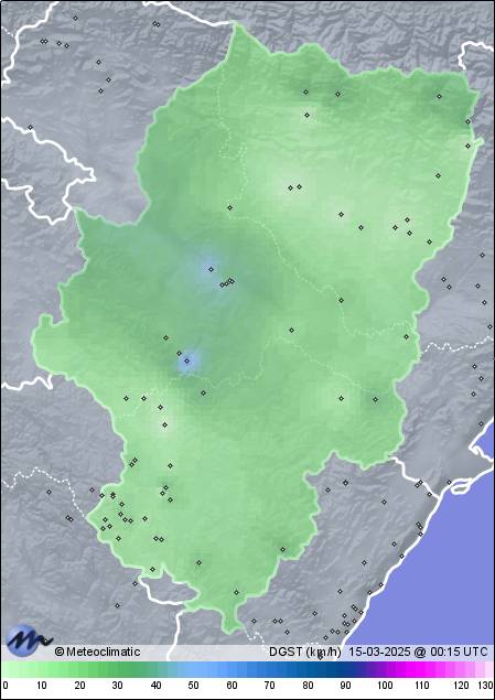 | 14-03-2025 | | | Máx. | Mín. | | | Temperatura | 3,8 | 0,4 | °C | | Humedad | 97 | 57 | % | | Viento | 29 | n/a | km/h |