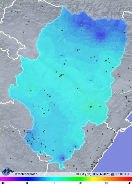 | 02-04-2025 | | | Máx. | Mín. | | | Temperatura | 15,1 | 5,8 | °C | | Humedad | 95 | 44 | % | | Viento | 46 | n/a | km/h | | Presión | 1.013 | 1.003 | hPa | | Precipitación | 9,4 | mm |