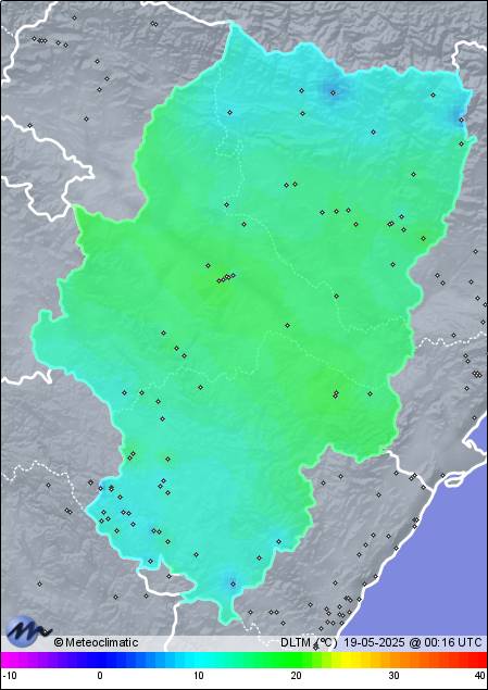| 18-05-2025 | | | Máx. | Mín. | | | Temperatura | 25,3 | 6,7 | °C | | Humedad | 95 | 36 | % | | Viento | 44 | n/a | km/h | | Presión | 1.018 | 1.015 | hPa | | Precipitación | 0,2 | mm |