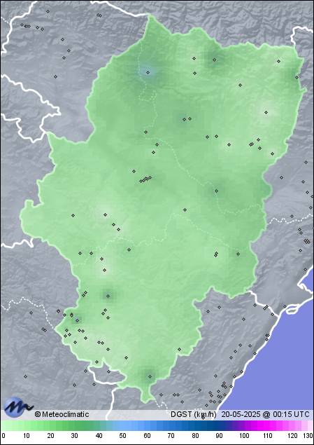 | 19-05-2025 | | | Máx. | Mín. | | | Temperatura | 15,5 | 4,9 | °C | | Humedad | 88 | 39 | % | | Viento | 37 | n/a | km/h | | Presión | 1.025 | 1.017 | hPa | | Precipitación | 0,0 | mm |