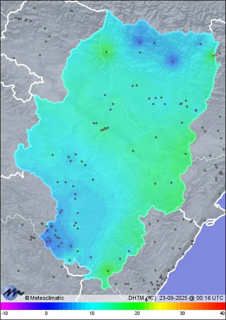 22-09-2025 | | Máx. | Mín. | | Temperatura | 16,9 | 4,7 | °C | Humedad | 89 | 47 | % | Viento | 13 | n/a | km/h | Presión | 1.015 | 1.012 | hPa | Precipitación | 0,0 | mm |