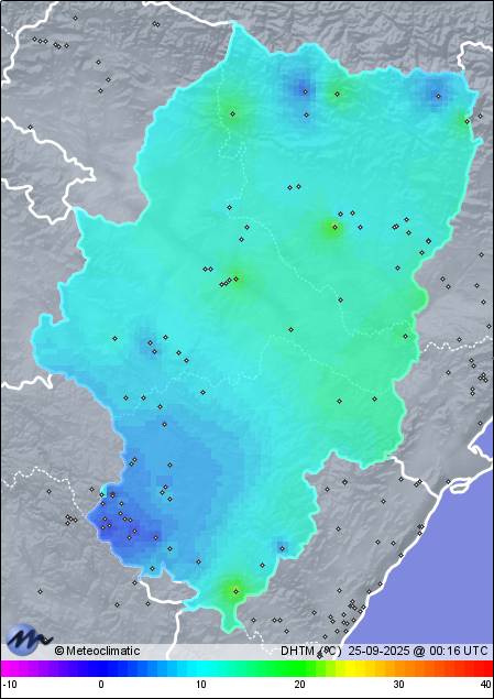 24-09-2025 | | Máx. | Mín. | | Temperatura | 18,4 | -0,9 | °C | Humedad | 93 | 34 | % | Viento | 35 | n/a | km/h | Presión | 1.027 | 1.023 | hPa | Precipitación | 0,0 | mm |