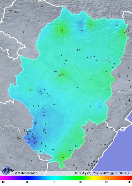 25-09-2025 | | Máx. | Mín. | | Temperatura | 18,9 | -0,1 | °C | Humedad | 89 | 29 | % | Viento | 13 | n/a | km/h | Presión | 1.026 | 1.021 | hPa | Precipitación | 0,0 | mm |