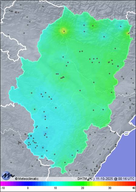 10-10-2025 | | Máx. | Mín. | | Temperatura | 18,9 | 7,2 | °C | Humedad | 93 | 58 | % | Viento | 18 | n/a | km/h | Presión | 1.023 | 1.020 | hPa | Precipitación | 0,0 | mm |