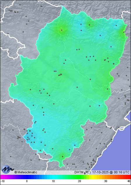 16-10-2025 | | Máx. | Mín. | | Temperatura | 19,6 | 7,9 | °C | Humedad | 97 | 57 | % | Viento | 31 | n/a | km/h | Precipitación | 0,0 | mm |