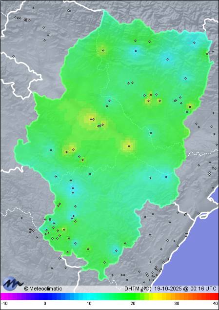 18-10-2025 | | Máx. | Mín. | | Temperatura | 19,5 | 7,5 | °C | Humedad | 81 | 32 | % | Viento | 24 | n/a | km/h | Precipitación | 0,0 | mm |