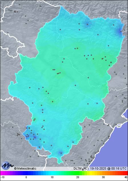 18-10-2025 | | Máx. | Mín. | | Temperatura | 19,1 | 3,8 | °C | Humedad | 97 | 34 | % | Viento | 17 | n/a | km/h | Presión | 1.026 | 1.021 | hPa | Precipitación | 0,0 | mm |