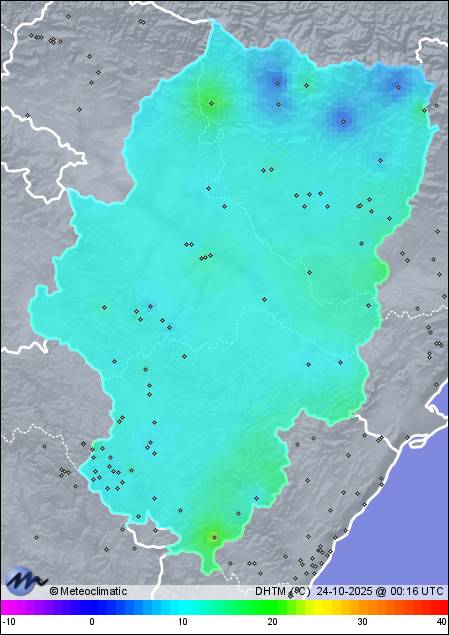 | 23-10-2025 | | | Máx. | Mín. | | | Temperatura | 19,7 | 8,0 | °C | | Humedad | 95 | 28 | % | | Viento | 48 | n/a | km/h | | Presión | 1.016 | 1.011 | hPa | | Precipitación | 2,0 | mm |