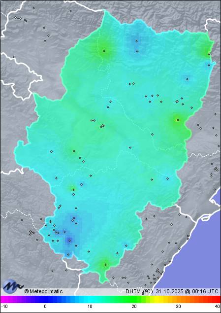 | Act. | Máx. | Mín. | Act. | Máx. | Mín. | Act. | Máx. | Mín. | Act. | Máx. | Hoy | Año |  |  | Alcañiz - Plana Santos | 330 | n/a | 22,8 | 10,3 | n/a | 99 | 60 | n/a | 1.018 | 1.013 | n/a | 9 | - | 330,9 |  |  |  | Alcañiz | 339 | n/a | 40,8 | 12,7 | n/a | x | x | n/a | 1.015 | 1.010 | n/a | 10 | 0,3 | 299,1 |  |  |  | Massalió | 382 | n/a | 23,3 | 8,9 | n/a | 93 | 56 | n/a | 1.017 | 1.011 | n/a | 21 | 0,4 | 343,2 |  |  |  | Burbáguena | 816 | n/a | 18,1 | 8,8 | n/a | 97 | 59 | n/a | 1.016 | 1.011 | n/a | 23 | - | 360,4 |  |  |  | Calamocha | 885 | n/a | 18,4 | 6,6 | n/a | 97 | 58 | n/a | 1.018 | 1.014 | n/a | 15 | - | 357,0 |  |  |  | Fuentes Claras-VOR | 930 | n/a | 17,2 | 7,8 | n/a | 95 | 59 | n/a | 1.016 | 1.010 | n/a | 32 | 0,2 | 184,2 |  |  |  | Rubielos de Mora | 936 | n/a | 18,9 | 6,2 | n/a | 96 | 48 | n/a | 1.015 | 1.009 | n/a | 21 | 0,2 | 485,0 |  |  |  | Loscos | 980 | n/a | 16,9 | 8,4 | n/a | 91 | 57 | n/a | 1.010 | 1.006 | n/a | 42 | - | 400,0 |  |  |  | Santa Eulalia del Campo | 983 | n/a | 18,4 | 5,3 | n/a | 100 | 55 | n/a | 1.016 | 1.011 | n/a | 13 | - | 241,0 |  |  |  | Torremocha del Jiloca | 994 | n/a | 18,5 | 5,6 | n/a | 99 | 56 | n/a | 1.020 | 1.014 | n/a | 18 | 0,2 | 239,2 |  |  |  | Villarquemado | 1009 | n/a | 17,3 | 6,4 | n/a | 99 | 58 | n/a | 1.020 | 1.013 | n/a | 20 | - | 239,3 |  |  |  | Manzanera | 1040 | n/a | 19,7 | 6,2 | n/a | 97 | 57 | n/a | 1.018 | 1.012 | n/a | 18 | 0,2 | 621,8 |  |  |  | Castelvispal | 1080 | n/a | 18,9 | 7,3 | n/a | 96 | 48 | n/a | x | x | n/a | 29 | x | x |  |  |  | Cubla | 1098 | n/a | 17,4 | 8,3 | n/a | 98 | 63 | n/a | x | x | n/a | 26 | - | 288,5 |  |  |  | Valverde (Calamocha) | 1110 | n/a | 15,8 | 7,1 | n/a | 95 | 17 | n/a | 1.027 | 1.027 | x | x | - | 127,8 |  |  |  | Alobras El Llano | 1120 | n/a | 16,6 | 4,4 | n/a | 99 | 60 | n/a | 1.021 | 1.015 | n/a | 28 | - | 78,1 |  |  |  | Albarracin - Polígono | 1148 | n/a | 19,0 | 4,7 | n/a | 98 | 52 | n/a | 1.022 | 1.016 | n/a | 20 | - | 14,0 |  |  |  | Ojos Negros | 1156 | n/a | 15,4 | 8,6 | n/a | 97 | 59 | n/a | 1.020 | 1.015 | n/a | 30 | - | 292,1 |  |  |  | Rubiales-Econatur | 1181 | n/a | 17,7 | 6,6 | n/a | 97 | 61 | n/a | 1.018 | 1.011 | n/a | 19 | 0,4 | 365,0 |  |  |  | Royuela | 1200 | n/a | 15,2 | 4,1 | n/a | 100 | 70 | n/a | 1.020 | 1.014 | n/a | 23 | 0,2 | 398,8 |  |  |  | Bueña | 1213 | n/a | 15,4 | 8,0 | n/a | 96 | 62 | n/a | 1.017 | 1.011 | n/a | 19 | 0,2 | 370,4 |  |  |  | Sierra Menera | 1220 | n/a | 14,4 | 9,0 | n/a | 96 | 65 | n/a | x | x | n/a | 38 | - | 304,7 |  |  |  | Torres de Albarracín | 1234 | n/a | 14,9 | 4,6 | n/a | x | x | n/a | 1.024 | 1.018 | n/a | 28 | - | 387,9 |  |  |  | Albarracin - Dornaque | 1240 | n/a | 16,7 | 2,3 | n/a | 99 | 61 | n/a | 1.020 | 1.012 | n/a | 17 | - | 476,3 |  |  |  | Tramacastilla | 1245 | n/a | 15,5 | 4,2 | n/a | 99 | 63 | n/a | 1.018 | 1.012 | n/a | 13 | - | 394,7 |  |  |  | Noguera de Albarracín | 1400 | n/a | 13,2 | 6,6 | n/a | 97 | 70 | n/a | 1.018 | 1.013 | n/a | 33 | - | 531,0 |  |  |  | Moscardón | 1415 | n/a | 13,2 | 5,1 | n/a | 98 | 68 | n/a | 1.018 | 1.013 | n/a | 28 | - | 57,9 |  |  |  | Villar del Cobo | 1430 | n/a | 12,3 | 6,1 | n/a | 99 | 75 | n/a | 1.023 | 1.017 | n/a | 28 | - | 647,6 |  |  |  | Frías de Albarracin | 1440 | n/a | 12,4 | 5,1 | n/a | 99 | 74 | n/a | 1.022 | 1.016 | n/a | 26 | - | 581,7 |  |  |  | Orihuela del Tremedal | 1447 | n/a | 9,4 | 9,1 | n/a | 87 | 86 | n/a | 1.018 | 1.018 | n/a | 27 | - | 535,2 |  |  |  | Orihuela del T. - Fraguas | 1455 | n/a | 12,5 | 6,3 | n/a | 99 | 72 | n/a | 1.019 | 1.017 | n/a | 59 | 0,1 | 438,9 |  |  |  | Guadalaviar | 1519 | n/a | 11,6 | 6,1 | n/a | 95 | 81 | n/a | 1.017 | 1.012 | n/a | 26 | - | 656,2 |  |  |  | Bronchales | 1596 | n/a | 11,9 | 6,3 | n/a | 95 | 76 | n/a | 1.017 | 1.011 | n/a | 55 | 0,2 | 542,0 |  |  |  | Griegos | 1604 | n/a | 11,1 | 6,4 | n/a | 85 | 74 | n/a | 1.015 | 1.009 | n/a | 31 | 0,2 | 584,2 |  |