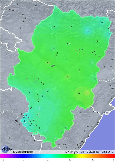 | Act. | Máx.  | Mín. | Act. | Máx. | Mín. | Act. | Máx. | Mín. | Act. | Máx. | Hoy | Año |  |  | Alcañiz | 339 | 12,1 | 15,2 | 12,0 | x | x | x | 1.016 | 1.016 | 1.015 | 5 N | 9 | - | 299,1 |  |  |  | Alcañiz - Plana Santos | 330 | 9,0 | 13,3 | 8,6 | 94 | 96 | 82 | 1.018 | 1.018 | 1.017 | - | 6 | - | 330,9 |  |  |  | Loscos | 980 | 12,2 | 12,7 | 11,9 | 72 | 80 | 72 | 1.010 | 1.010 | 1.009 | - | 53 | - | 400,0 |  |  |  | Rubielos de Mora | 936 | 10,4 | 12,0 | 8,5 | 78 | 84 | 74 | 1.015 | 1.015 | 1.014 | 10 ENE | 16 | - | 485,0 |  |  |  | Cubla | 1098 | 11,3 | 11,8 | 9,8 | 80 | 86 | 79 | x | x | x | 9 SSW | 22 | - | 288,5 |  |  |  | Ojos Negros | 1156 | 9,1 | 11,5 | 7,8 | 80 | 90 | 72 | 1.020 | 1.020 | 1.019 | - | 24 | - | 292,1 |  |  |  | Sierra Menera | 1220 | 10,0 | 11,2 | 8,3 | 78 | 88 | 75 | x | x | x | 4 WSW | 37 | - | 304,7 |  |  |  | Torres de Albarracín | 1234 | 9,5 | 10,7 | 4,3 | x | x | x | 1.022 | 1.024 | 1.022 | - | 17 | - | 387,9 |  |  |  | Burbáguena | 816 | 7,5 | 10,5 | 7,2 | 90 | 92 | 83 | 1.016 | 1.016 | 1.015 | 6 SSE | 19 | - | 360,4 |  |  |  | Bueña | 1213 | 7,2 | 10,2 | 5,8 | 87 | 94 | 78 | 1.016 | 1.017 | 1.016 | 5 ENE | 13 | - | 370,4 |  |  |  | Noguera de Albarracín | 1400 | 8,9 | 10,1 | 8,6 | 82 | 87 | 79 | 1.017 | 1.017 | 1.016 | 5 NW | 26 | - | 531,0 |  |  |  | Tramacastilla | 1245 | 6,7 | 10,1 | 3,8 | 96 | 99 | 81 | 1.017 | 1.018 | 1.015 | - | 9 | - | 394,7 |  |  |  | Moscardón | 1415 | 9,5 | 10,0 | 8,7 | 76 | 83 | 76 | 1.017 | 1.018 | 1.016 | 10 SW | 39 | - | 57,9 |  |  |  | Royuela | 1200 | 9,3 | 10,0 | 4,0 | 87 | 98 | 85 | 1.019 | 1.019 | 1.018 | 2 SW | 13 | - | 398,8 |  |  |  | Orihuela del Tremedal | 1447 | 8,7 | 9,7 | 8,7 | 84 | 87 | 84 | 1.017 | 1.018 | 1.016 | 6 NNW | 31 | - | 535,2 |  |  |  | Villar del Cobo | 1430 | 8,9 | 9,6 | 8,8 | 81 | 86 | 81 | 1.022 | 1.022 | 1.021 | 2 WSW | 26 | - | 647,6 |  |  |  | Frías de Albarracin | 1440 | 8,5 | 9,5 | 8,4 | 84 | 87 | 83 | 1.020 | 1.021 | 1.019 | 5 SW | 18 | - | 581,7 |  |  |  | Orihuela del T. - Fraguas | 1455 | 8,5 | 9,4 | 8,5 | 82 | 84 | 81 | 1.018 | 1.018 | 1.017 | 29 NW | 75 | - | 438,9 |  |  |  | Guadalaviar | 1519 | 8,4 | 9,3 | 8,4 | 83 | 87 | 83 | 1.016 | 1.017 | 1.016 | 6 NNW | 27 | - | 656,2 |  |  |  | Albarracin - Polígono | 1148 | 7,4 | 8,9 | 3,9 | 92 | 97 | 85 | 1.021 | 1.022 | 1.021 | - | 7 | 0,3 | 14,0 |  |  |  | Massalió | 382 | 7,2 | 8,9 | 7,2 | 92 | 92 | 91 | 1.017 | 1.017 | 1.016 | - | 11 | 0,2 | 343,2 |  |  |  | Griegos | 1604 | 7,3 | 8,3 | 7,3 | 84 | 85 | 84 | 1.014 | 1.015 | 1.013 | 13 WNW | 35 | - | 584,2 |  |  |  | Bronchales | 1596 | 7,3 | 7,9 | 7,3 | 86 | 89 | 85 | 1.015 | 1.016 | 1.014 | - | 64 | - | 542,0 |  |  |  | Calamocha | 885 | 5,7 | 7,8 | 5,1 | 96 | 96 | 91 | 1.018 | 1.018 | 1.017 | - | 6 | - | 357,0 |  |  |  | Albarracin - Dornaque | 1240 | 5,2 | 7,6 | 2,1 | 99 | 99 | 99 | 1.018 | 1.019 | 1.017 | - | 11 | - | 476,3 |  |  |  | Rubiales-Econatur | 1181 | 6,8 | 7,5 | 5,8 | 96 | 96 | 91 | 1.017 | 1.018 | 1.017 | - | 5 | - | 364,8 |  |  |  | Valverde (Calamocha) | 1110 | 7,3 | 7,5 | 6,3 | 53 | 61 | 43 | 1.026 | 1.026 | 1.026 | x | x | - | 127,8 |  |  |  | Villarquemado | 1009 | 6,6 | 7,4 | 5,3 | 98 | 98 | 92 | 1.019 | 1.020 | 1.018 | 4 SE | 9 | - | 239,3 |  |  |  | Alobras El Llano | 1120 | 6,0 | 6,7 | 5,1 | 97 | 99 | 92 | 1.021 | 1.021 | 1.019 | - | 13 | - | 78,1 |  |  |  | Torremocha del Jiloca | 994 | 3,9 | 5,9 | 3,5 | 97 | 98 | 92 | 1.019 | 1.020 | 1.019 | 2 E | 13 | - | 239,2 |  |  |  | Manzanera | 1040 | 5,1 | 5,6 | 4,7 | 95 | 96 | 93 | 1.018 | 1.019 | 1.017 | - | 6 | 0,2 | 621,8 |  |  |  | Santa Eulalia del Campo | 983 | 4,1 | 5,4 | 3,1 | 97 | 97 | 94 | 1.016 | 1.017 | 1.016 | - | 2 | - | 241,0 |  |
