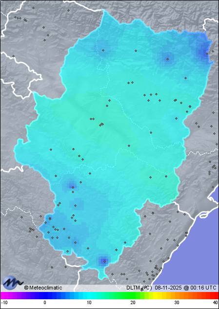 | 07-11-2025 | | | Máx. | Mín. | | | Temperatura | 11,7 | 3,6 | °C | | Humedad | 95 | 72 | % | | Viento | 30 | n/a | km/h | | Presión | 1.016 | 1.014 | hPa | | Precipitación | 0,0 | mm |