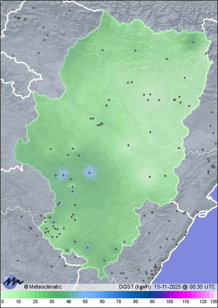 | Actualizado:14-11-2025 23:48 UTC | 9,1°C 80% | 15,7 °C / 96% | | 7,9°C / 62% | | 6 km/h SE | | 35 km/h | | 1.013 hPa | | 0,2 mm |
