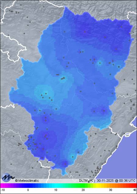 | 30-11-2025 | | | Máx. | Mín. | | | Temperatura | 12,5 | -6,9 | °C | | Humedad | 95 | 41 | % | | Viento | 18 | n/a | km/h | | Presión | 1.022 | 1.015 | hPa | | Precipitación | 0,0 | mm |