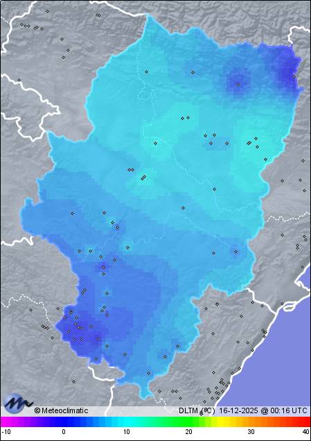 | 15-12-2025 | | | Máx. | Mín. | | | Temperatura | 8,7 | 4,9 | °C | | Humedad | 97 | 86 | % | | Viento | 16 | n/a | km/h | | Presión | 1.022 | 1.011 | hPa | | Precipitación | 7,6 | mm |