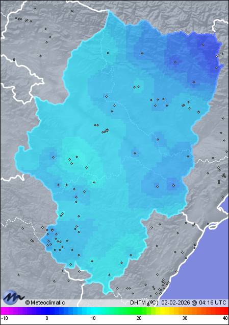 | Actualizado: 02:10 UTC | 4,7°C 92% | 4,8 °C / 93% | | 3,0°C / 90% | | 3 km/h NNE | | 6 km/h | | 1.004 hPa | | 0,2 mm |