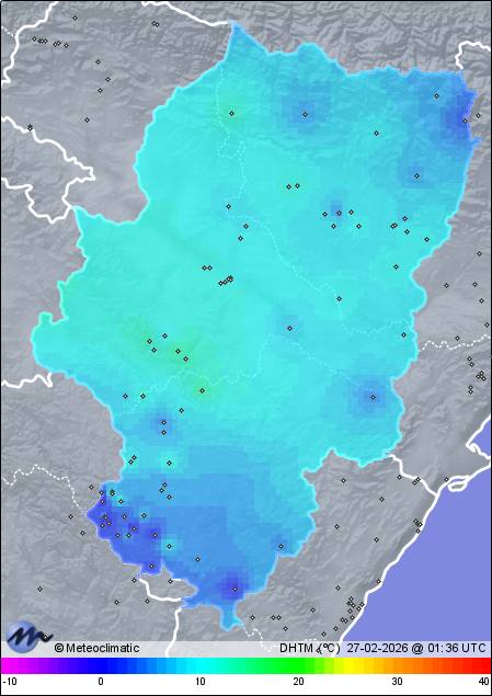 | Actualizado: 00:01 UTC | 6,3°C 93% | 7,4 °C / 93% |  | | 6,2°C / 92% | | Calma | | 5 km/h | | 1.030 hPa |